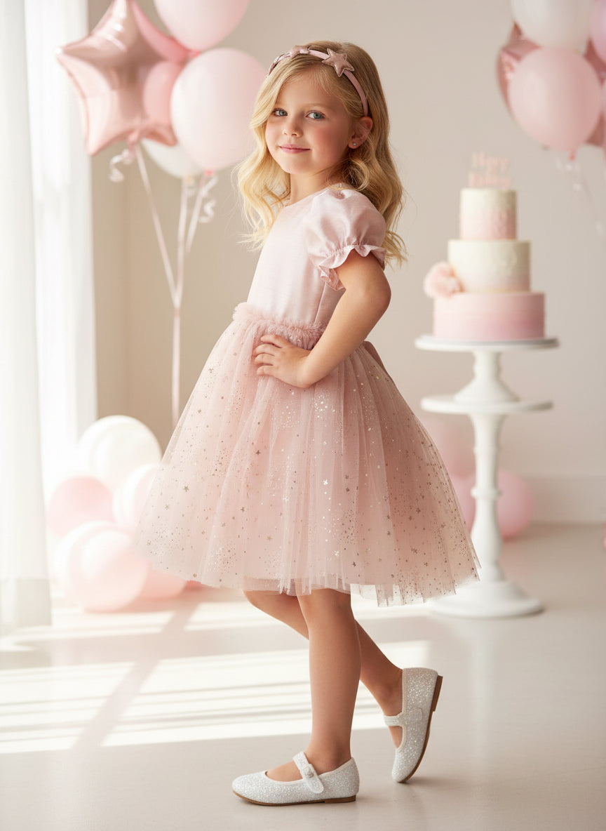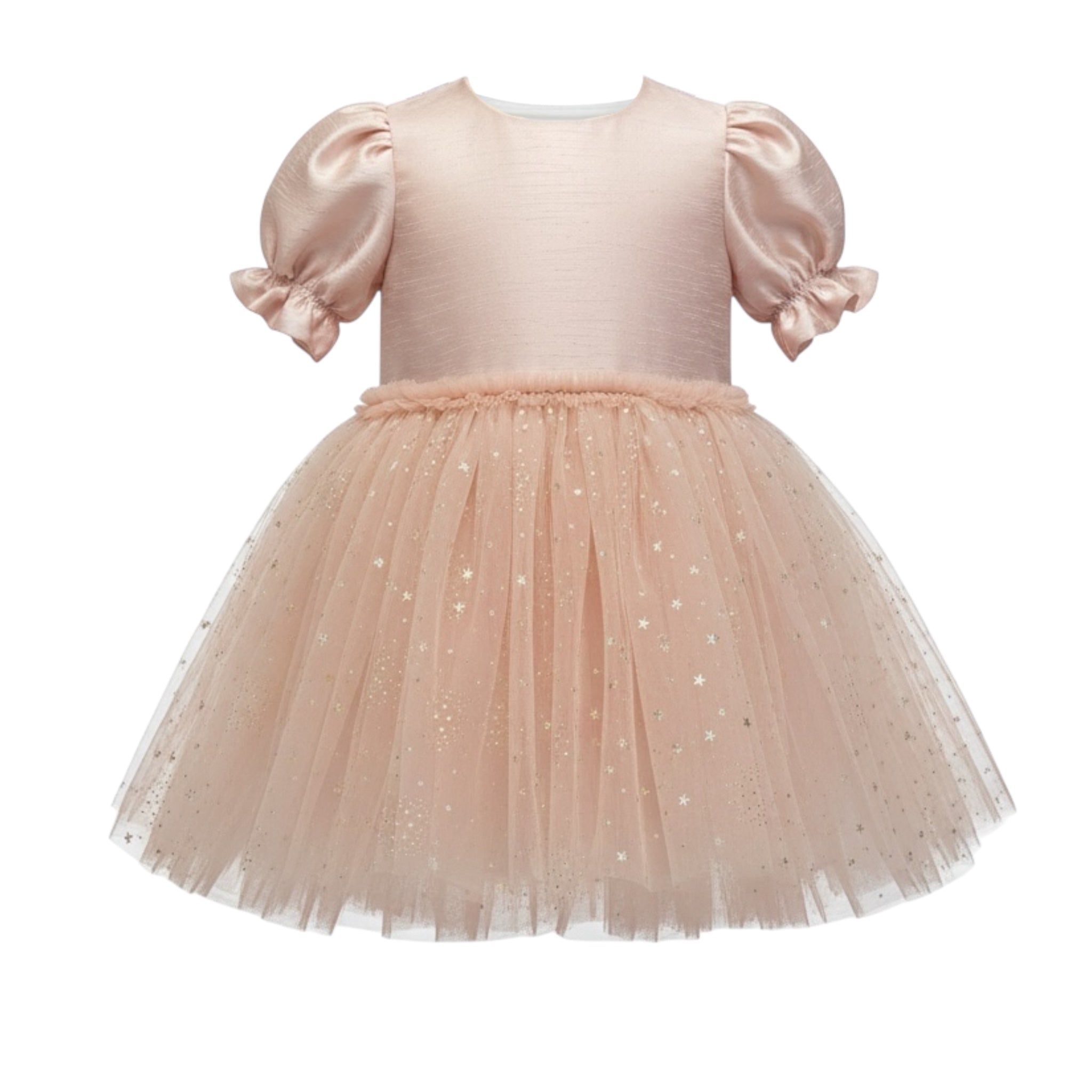 Etek kısmı yıldız desenli parlak tül kumaşla tamamlanmış, elbiseye büyüleyici bir görünüm kazandırılmıştır.