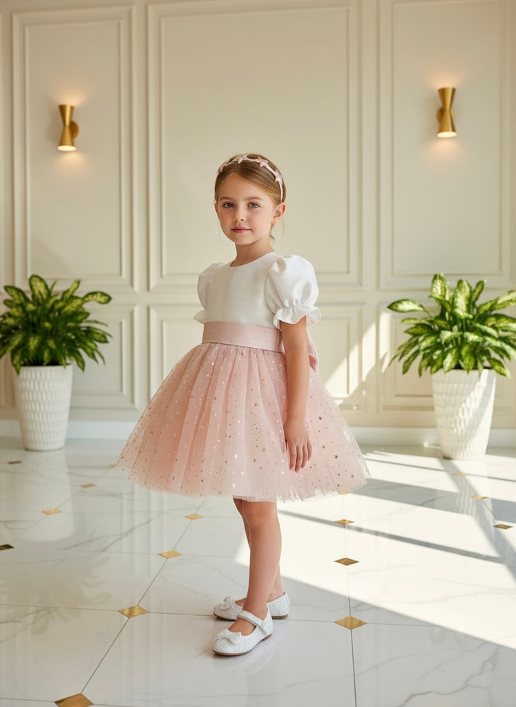 Zarafeti ve ışıltıyı bir araya getiren bu özel tasarım elbise, minik prensesler için tasarlandı.