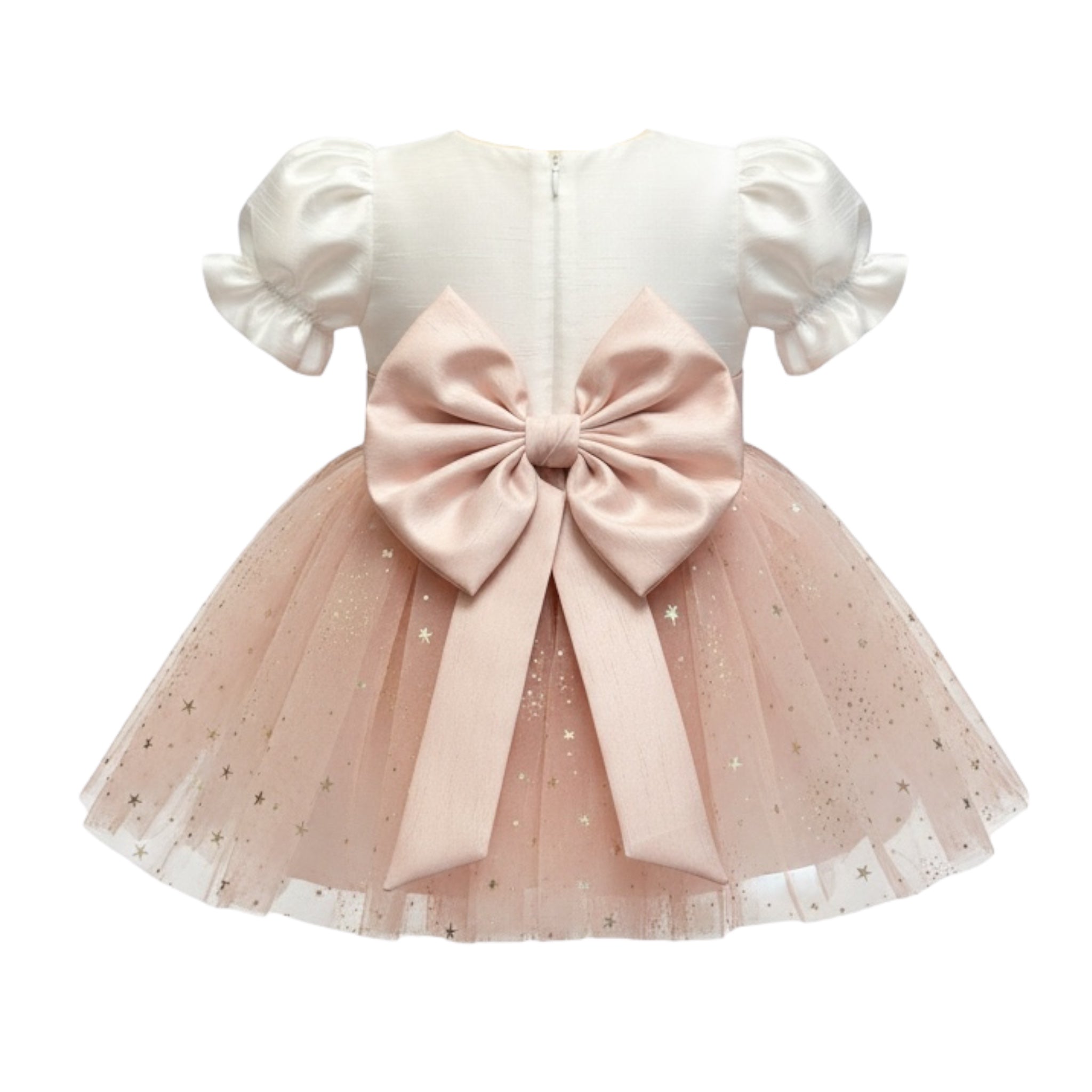 Etek kısmı yıldız desenli parlak tül kumaşla tamamlanmış, elbiseye büyüleyici bir görünüm kazandırılmıştır.