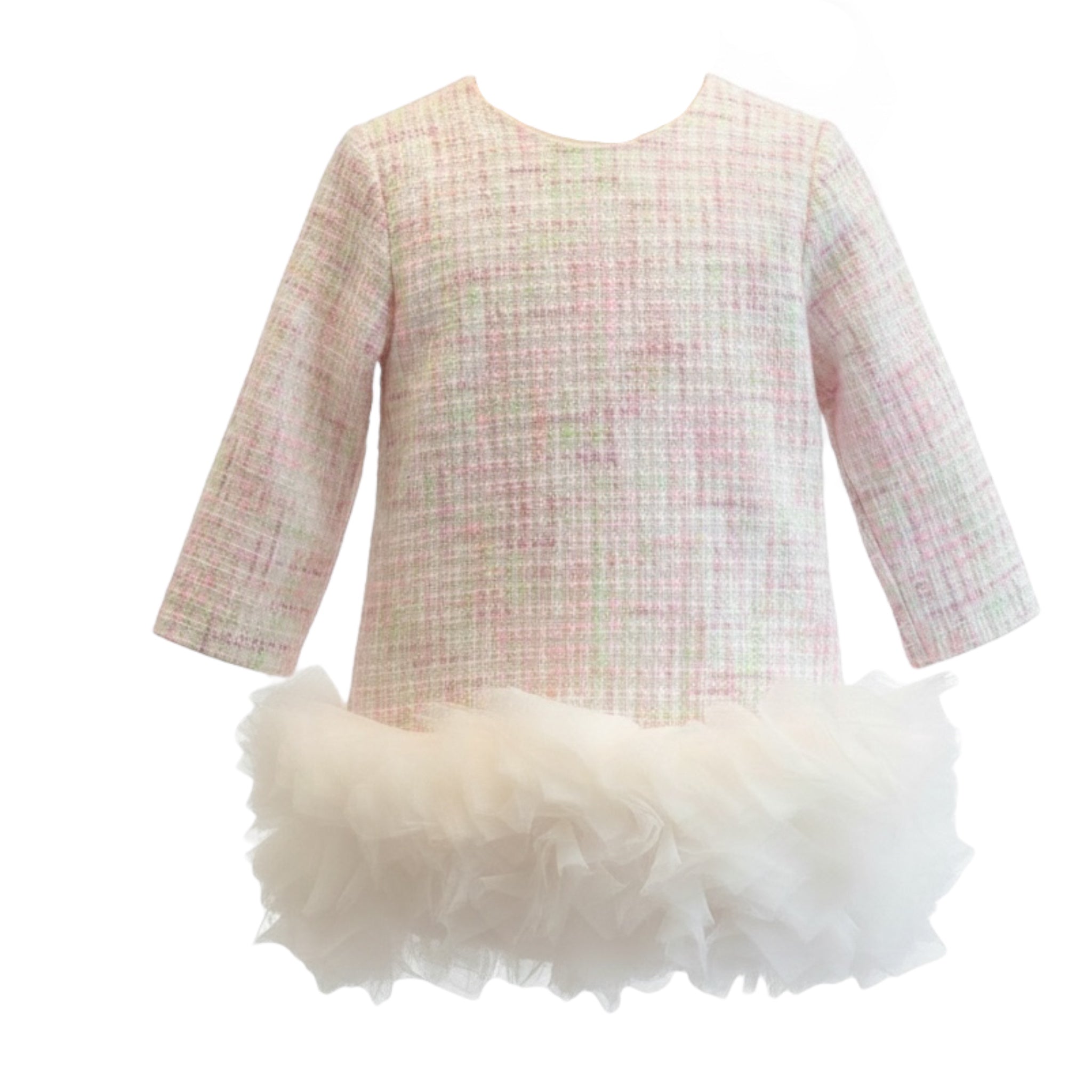 Alt kısmı kat kat tül kumaşla hazırlanmıştır; böylece elbiseye hem hacim hem de romantik bir görünüm kazandırır.
